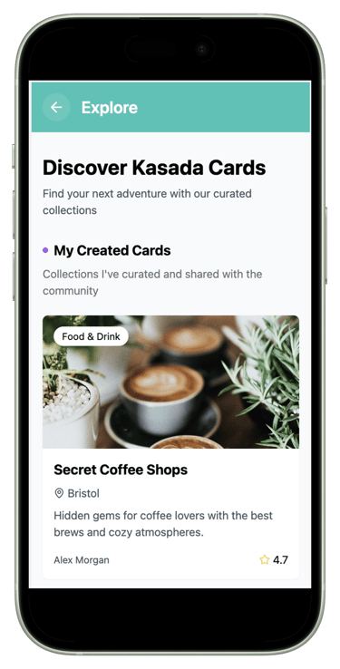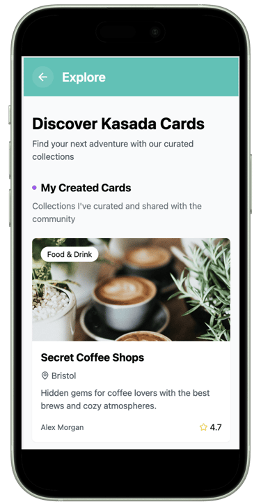 Unlock adventures with featured Kasada Cards, handpicked challenges from local businesses in your community and earn rewards as you explore.